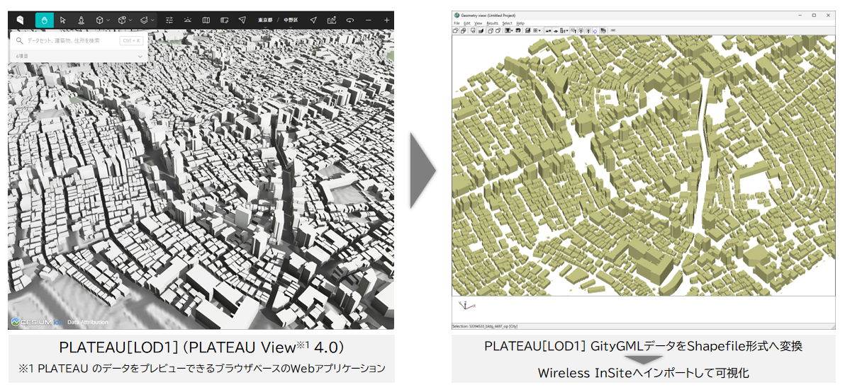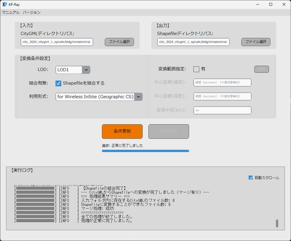 日本全国の都市デジタルツイン実現プロジェクト「PLATEAU」で公開されている3D都市モデルをShapefile形式へ変換 PLATEAU変換ツール「KP-Ray」は、国土交通省が推進する "日本全国の都市デジタルツイン実現プロジェクト"「PLATEAU」で公開されている3D都市モデルを、Shapefile形式へ変換することが可能です。 電波伝搬シミュレータ「RapLab」(構造計画研究所)および「Wireless InSite」(Remcom社)に取り込み可能な形式で出力することができ、PLATEAUで公開されている市区町村の都市3Dモデルを伝搬シミュレーションにご活用いただけます。 PLATEAUオープンデータは一般社団法人社会基盤情報流通推進協議会が運用する「G空間情報センター」においてダウンロードが可能です。 特徴 簡単な操作で変換可能 変換対象のCityGMLファイルが格納されているフォルダ、利用形式(Wireless InSite または RapLab)、出力先フォルダを設定するだけで変換できます。 複数CityGMLファイル ⇒ 1つのShapeファイルに結合 解析を実行したい場所が複数のCityGMLファイルで構成されている場合、結合したいCityGMLを同一フォルダに格納して、結合有無をチェックオンにすることで1つのShapeファイルに結合することが可能です。 Shapeファイルの変換範囲指定 円の中心座標(緯度、経度)と半径を指定することにより、変換後のShapeファイルを円形に切り出すことができます。 お知らせ 【2025/12/22】PLATEAU変換ツール「KP-Ray ver1.0」をリリースしました。 製品情報 動作環境 OS Windows 10/11, 64bit CPU Intel i3 (Intel i7 以上推奨) RAM 16GB以上(32GB 以上推奨) 空きディスク容量 変換するPLATEAU CityGMLファイルによる ライセンス形態 本ツールは、RapLab または Wireless InSiteの保守ユーザを対象としております。 毎年7月1日時点で保守契約が有効なユーザにダウンロード情報をご連絡いたします。 *上記以外の動作環境についてはお問合せください。 入力可能なファイル形式 PLATEAU 建築物モデル(LOD1):CityGML形式 リリース情報 PLATEAU変換ツール「KP-Ray ver1.0」を2025年12月22日にリリースしました。 過去のリリース情報 (なし) 関連情報 PLATEAU 3D都市モデルを活用した電波伝搬シミュレーション PLATEAUモデルを活用したレイトレース法による電波伝搬シミュレーションを行い、 実測データに対する精度を検証しました。 PLATEAU 3D都市モデルを活用した電波伝搬シミュレーション 製品ラインナップ一覧に戻る CONTACTお問い合わせ 一般的なシステム開発に加え、物理層からアプリケーション層まで通信システム全般についてお困りの際はぜひ一度私たちにお問い合わせください。 お問い合わせはこちら